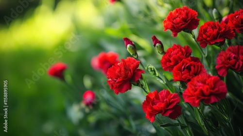 A vibrant composition of red carnations against a lush green garden backdrop, close-up shot, Naturalistic style
