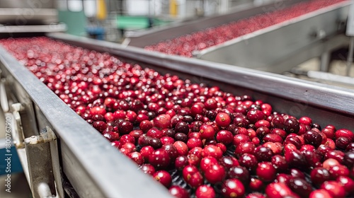 A vibrant conveyor belt filled with fresh red cranberries in a processing facility.