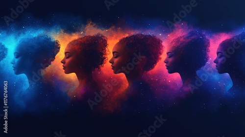 A vibrant, cosmic depiction of profiles with colorful nebula backgrounds.