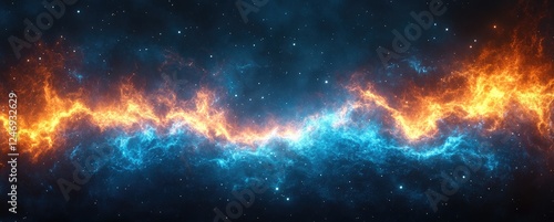A vibrant cosmic scene depicting swirling blue and orange gases in a starry background.