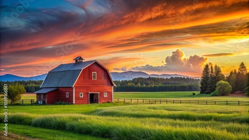 A vibrant crimson barn stands proudly amidst a lush grassy field, silhouetted against a breathtaking backdrop of a fiery sunset and rolling hills.