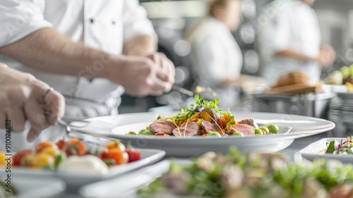 A vibrant culinary scene showcasing chefs plating gourmet dishes. Fresh ingredients artistically arranged on elegant plates.