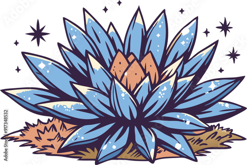 A vibrant depiction of a blue agave plant surrounded by twinkling stars on grassy terrain during twilight.