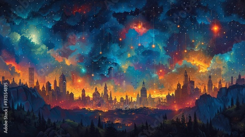 A vibrant depiction of a city skyline at night with each building illuminated by colorful lights, representing dreams coming to life