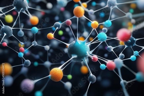 A vibrant depiction of interconnected molecules with colorful atoms, representing scientific research and innovation.