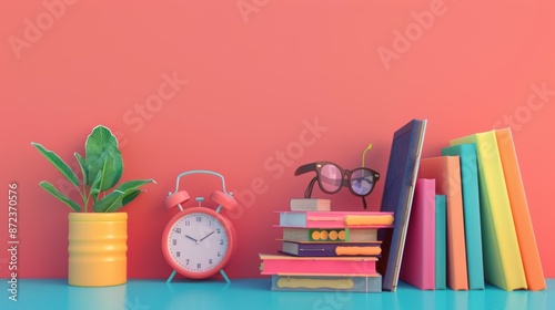 A vibrant desk setup with a colorful scheme, featuring an alarm clock, books, glasses, and a potted plant, creating a cheerful and organized workspace atmosphere.