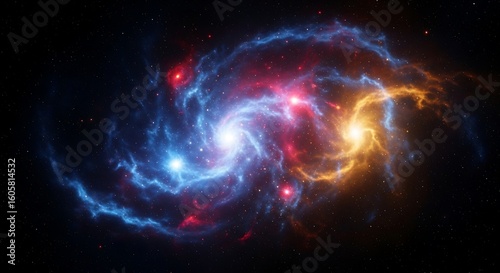 A vibrant, detailed depiction of a swirling galaxy with blue, red, and yellow hues against a dark, star-filled background.