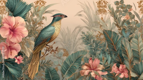 A vibrant, detailed illustration of a bird amidst lush tropical foliage and flowers