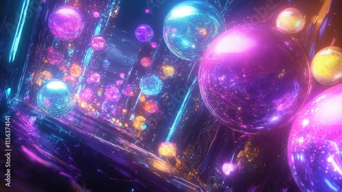 A vibrant digital art scene of glowing multicolored spheres connected by neon lines, creating a futuristic network.