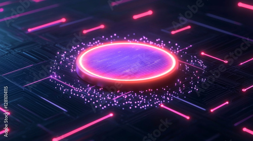 A vibrant digital circle surrounded by glowing particles on a circuit-like background.