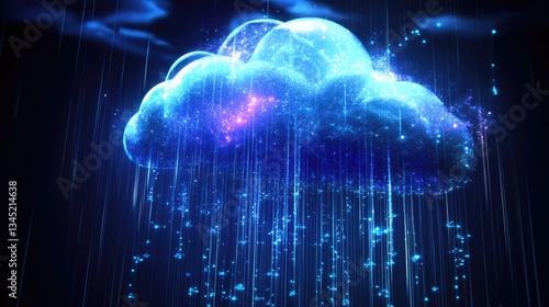 A vibrant digital cloud emitting glowing rain, set against a dark background with shimmering particles