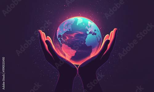 A vibrant digital illustration of hands cradling a glowing Earth, symbolizing care for the planet and global unity.
