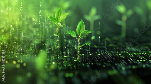 A vibrant digital landscape showcasing young plants sprouting amidst a backdrop of data streams, symbolizing the fusion of nature and technology.