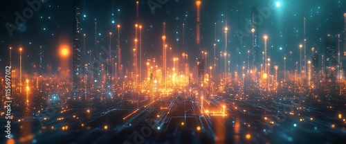A vibrant digital landscape with glowing data streams and abstract lights.