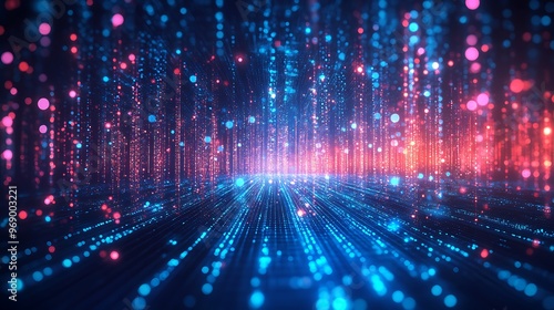 A vibrant digital landscape with glowing particles and lines creating a cosmic flow of data and energy in blue and pink hues.