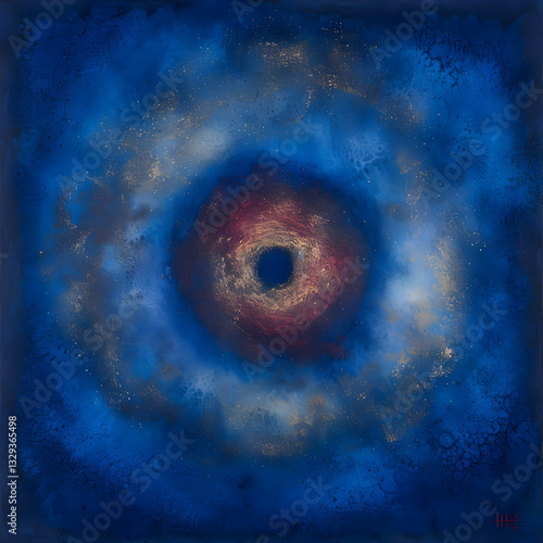 A vibrant digital painting depicts a cosmic scene with a dark center surrounded by swirling blues, reds, and golds