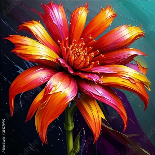 A vibrant digital painting of a fiery red and orange flower with dynamic, flowing petals against a dark, abstract background. The artwork blends realism and fantasy, creating a striking visual effect.