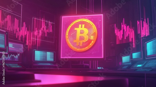 A vibrant digital representation of Bitcoin, symbolizing modern cryptocurrency trading with neon technology and analytic graphs.