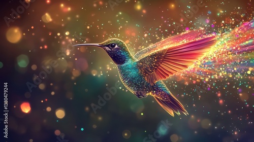 A vibrant, digitally rendered hummingbird is depicted mid-flight against a dark background