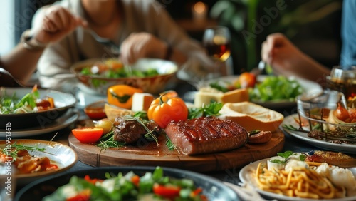 A vibrant dining scene featuring an array of gourmet dishes with fresh ingredients, emphasizing social enjoyment and culinary experience