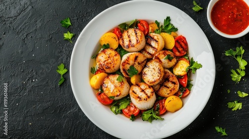 A vibrant dish featuring grilled scallops, fresh vegetables, and a tangy sauce, beautifully presented on a dark background.