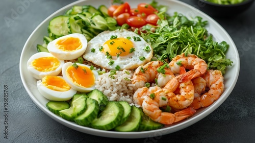 A vibrant dish featuring shrimp, fried eggs, fresh vegetables, and rice, beautifully arranged on a circular plate.