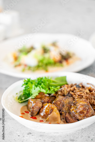 A vibrant dish featuring succulent meat pieces, grains, and fresh greens, elegantly presented in a white bowl. A blurred background displays another beautifully plated meal, enhancing the dining