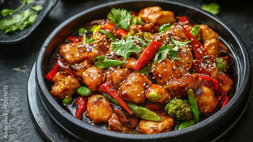 A vibrant dish of stir-fried chicken with colorful vegetables, garnished with sesame seeds and herbs.