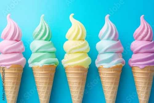 A vibrant display features a set of five colorful ice cream cones in pastel shades against a bright blue background. Ideal for evoking summer joy and sweetness