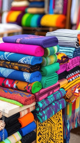 A vibrant display of assorted textiles in a range of colors and patterns, showcasing cultural craftsmanship and artistry.