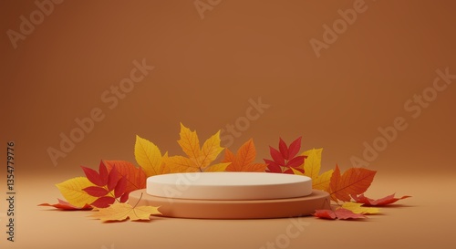 A vibrant display of autumn leaves in orange, yellow, and red surrounds a simple round platform, perfect for showcasing seasonal products in autumn-themed marketing.