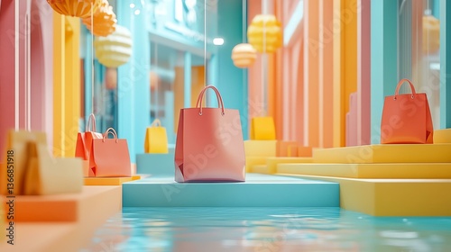 A vibrant display of colorful handbags arranged in a playful shopping environment
