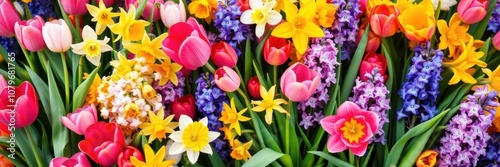 A vibrant display of colorful spring flowers in full bloom, including tulips, daffodils, and hyacinths, blossoms, beauty