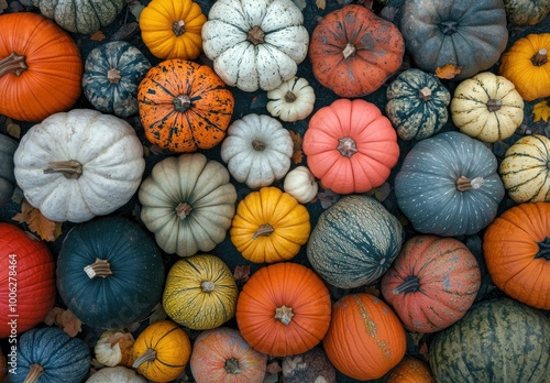 A vibrant display of different types and colors of pumpkins, arranged in an overhead view to showcase their diversity. Created with Ai