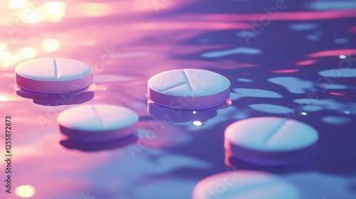 A vibrant display of floating pills, refracted by underwater light, creating an abstract, glowing effect