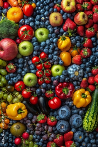 A vibrant display of fresh vegetables and berries including tomatoes, grapes and strawberries, creating a colorful and healthy food backdrop