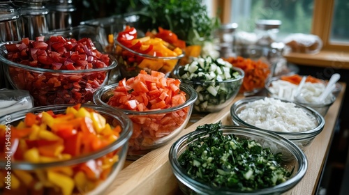 A vibrant display of freshly chopped vegetables arranged in glass bowls, showcasing a variety of colors and textures ideal for healthy meal preparations and recipes.