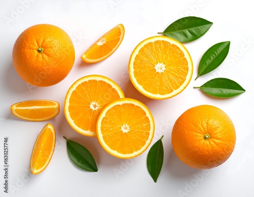 A vibrant display of juicy oranges and verdant leaves, evoking freshness and natural allure