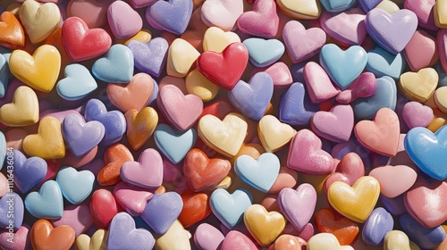 A vibrant display of multicolored candy hearts arranged closely together. This colorful and cheerful composition is ideal for Valentine's Day or themes of love and celebration