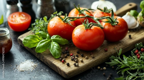 A vibrant display of ripe red tomatoes on a wooden cutting board, surrounded by fresh herbs and spices, emphasizing the freshness and color of ingredients for a delicious meal