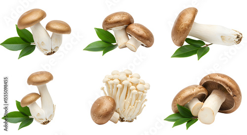 A vibrant display of various mushrooms on green leaves, showcasing their unique shapes and colors against a white background