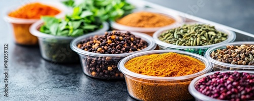 A vibrant display of various spices in plastic containers, showcasing colorful powders and herbs on a dark surface.