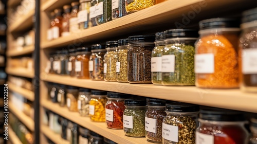 A vibrant display of various spices neatly organized in glass jars on wooden shelves, perfect for culinary inspiration.