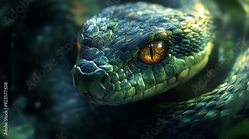 A vibrant emerald green snake rests among verdant leaves, showcasing its striking scales and captivating amber eyes