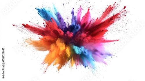A vibrant explosion of colorful powders, creating a dynamic burst of reds, blues, and oranges against a white background.