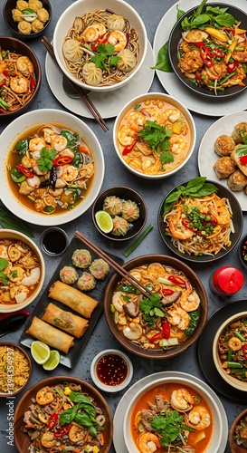 A vibrant feast of Asian cuisine, a colorful array of shrimp dishes and noodle soups, spring rolls, and dumplings, all beautifully arranged with warm lighting.