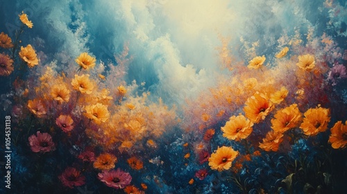 A vibrant field of orange and pink wildflowers blooms under a blue sky with white clouds.