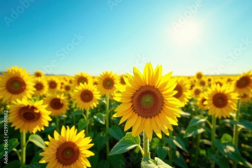 A vibrant field of sunflowers basking in the warm sunlight, showcasing the beauty of nature's golden blooms under a clear blue sky.