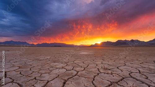 A vibrant, fiery sunset over a cracked desert floor with mountains in the background, creating a dramatic and colorful landscape.