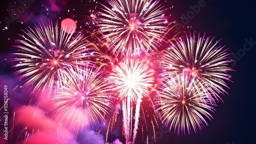 A vibrant firework explosion fills the night sky with glittering lights